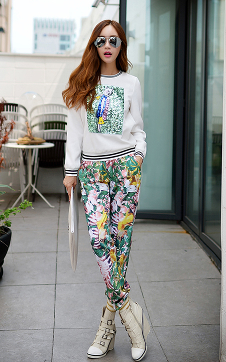 简洁大气的套头卫衣,亮片的装饰,格外亮眼,下身搭配休闲裤,唯美的印花,与春天为舞!