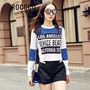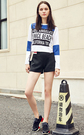 个性的字母印花,时髦拼色短款T恤,搭配条纹拼色休闲短裤,街拍欧美范。
