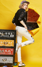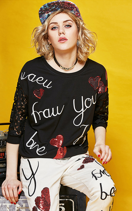 心形亮片元素,个性的英文字母,镂空七分袖t恤,字母亮片白色牛仔裤,休闲欧美潮范。