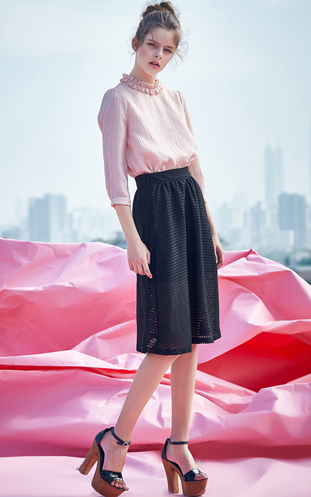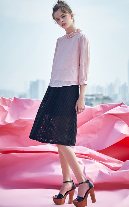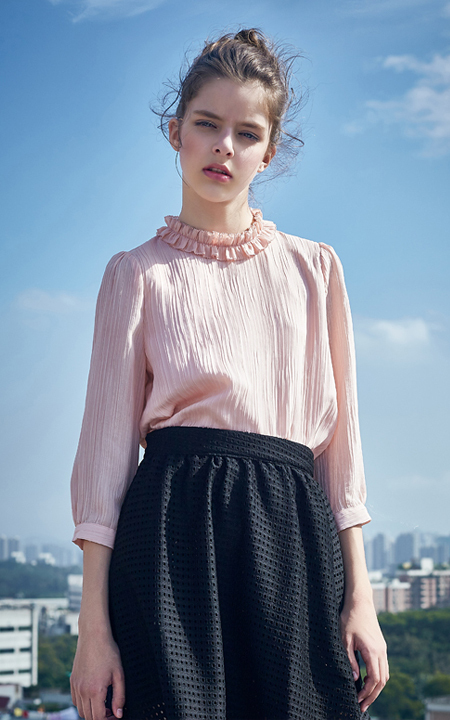 可爱的花边领,粉色七分袖雪纺衫,搭配高腰黑色网纱裙,超级显瘦。减龄又显气质,欧美大牌范。