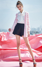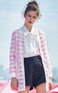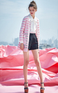 经典的粉白条纹,薄款中长款棒球服,搭配白衬衫和收腰短款,凸显知性优雅,非常减龄的搭配。