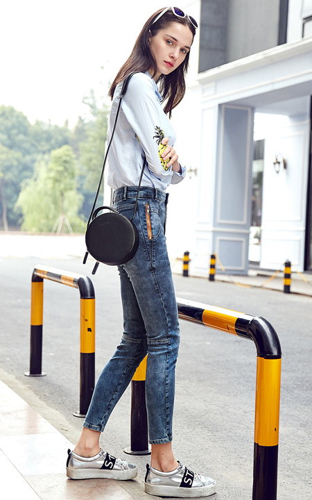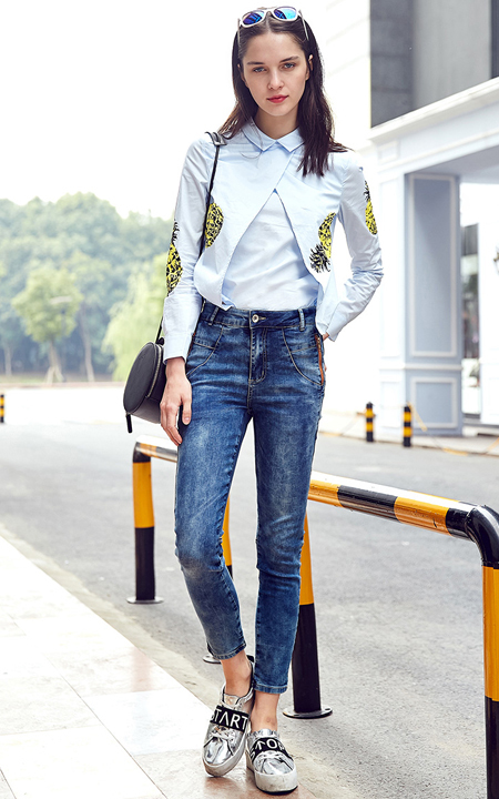 卡通菠萝印花,拼贴长袖衬衫,假两件设计非常时尚。搭配水洗做旧牛仔裤,休闲欧美风。