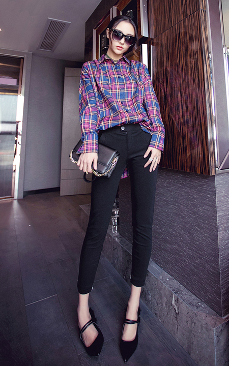 翻领格子衬衫,优质的面料,贴身穿很舒适,搭配时髦的小脚裤,修身的版型,配一双尖头单鞋,很不错哟!