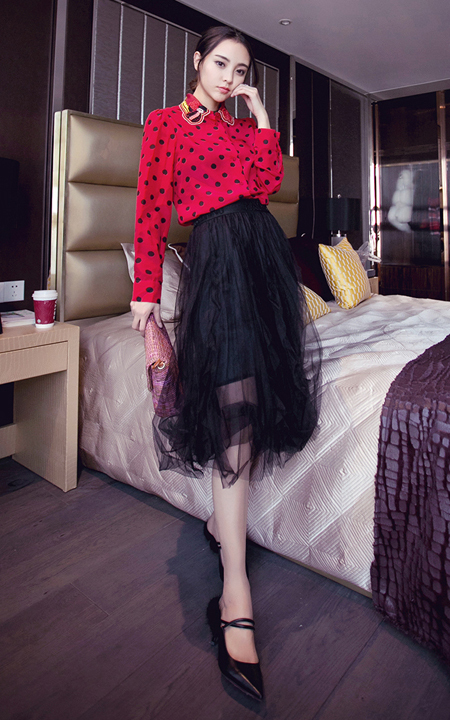 甜美迷人的衬衫,波点的装饰,可爱俏皮,上身很不错,搭配网纱透视半身裙,女人味十足!