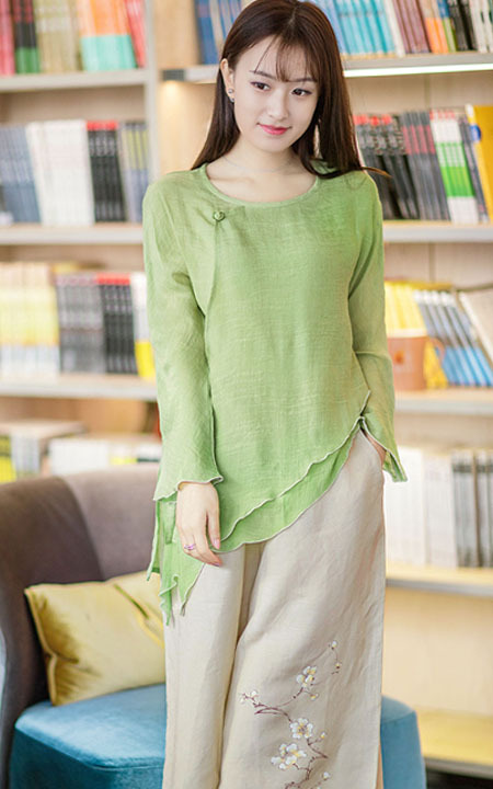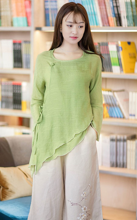 中国风亚麻衬衫,天丝的纹理平和,淡淡的横纹疏密温雅,搭配亚麻七分阔腿裤,复古文艺。