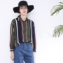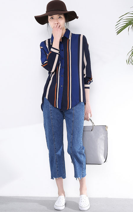蓝色条纹衬衫显得沉稳大气,衬衣唯有与牛仔裤搭配才无法超越,恒久经典。