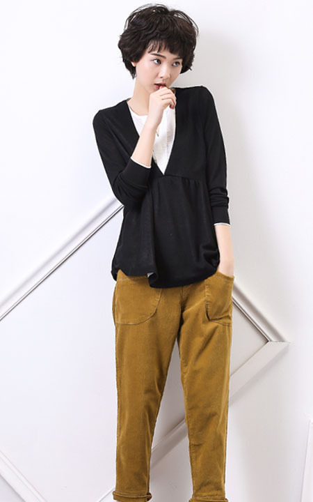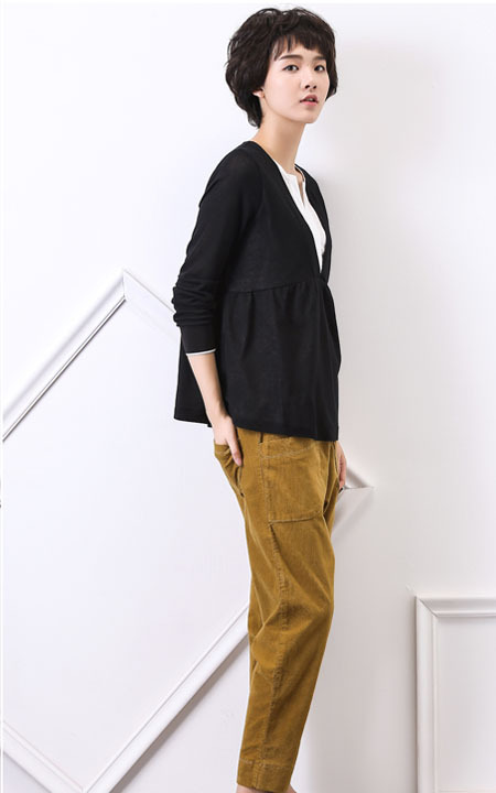 实在是帅气百搭又实穿的九分裤,搭配假两件打底衫,简单文艺。