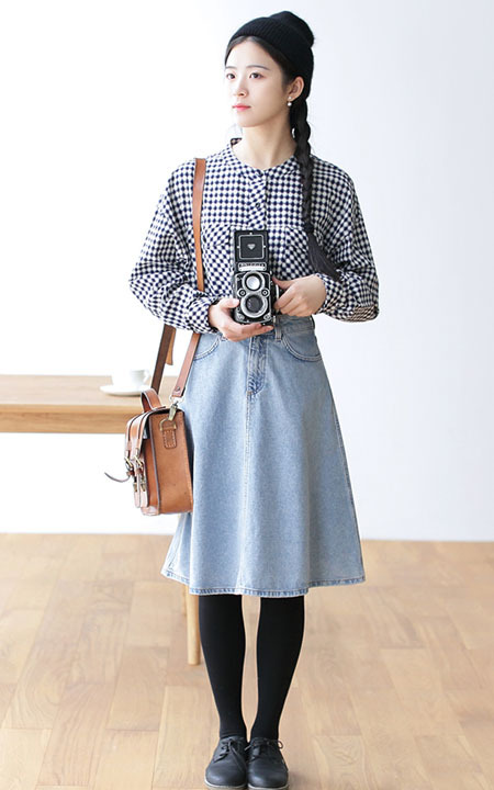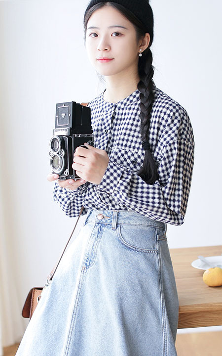 经典的黑白格衬衫,气质小立领,拼贴的翻盖口袋,搭配高腰裙,特别文艺范。