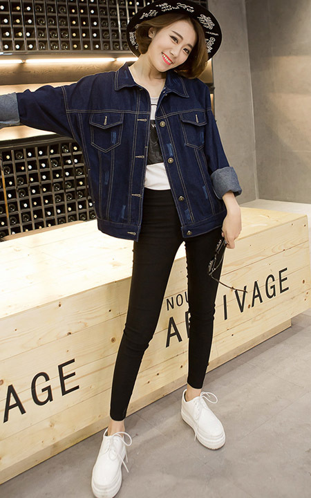 复古宽松牛仔外套,是春季人手一件的必备单品,口袋磨破设计彰显个性,搭配黑色小脚裤,休闲又时髦