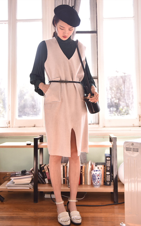 雪纺衫的设计很有风格,精美的百褶设计显得很精致细腻,半高领设计搭配这款毛呢背心开叉裙十分清新,不失复古风格