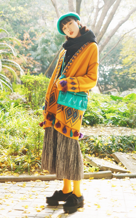 很有味道的一款流苏毛衣,黄色羊毛打造的波普风,搭配亮色的画家帽和休闲的皮鞋,时尚有个性
