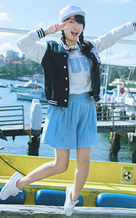 经典的棒球服元素,大大的A字母徽章,搭配字母贴布卫衣和松紧腰百褶裙,穿双白色帆布鞋,蓝和白的组合,清新学院风。