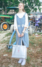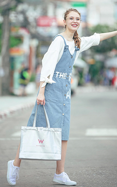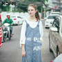 青春减龄的牛仔背带裙,字母图案点缀,更增添时尚感,内搭蝴蝶结袖口白色雪纺衫,简简单单,很学院妹的感觉,青春时尚