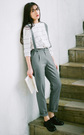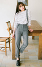 宽松的吊带+开衫两件套,棉麻的材质噢,上身很舒服呢,透气吸湿,橡皮粉很显肤白,搭配一字扣粗跟鞋,休闲又好看