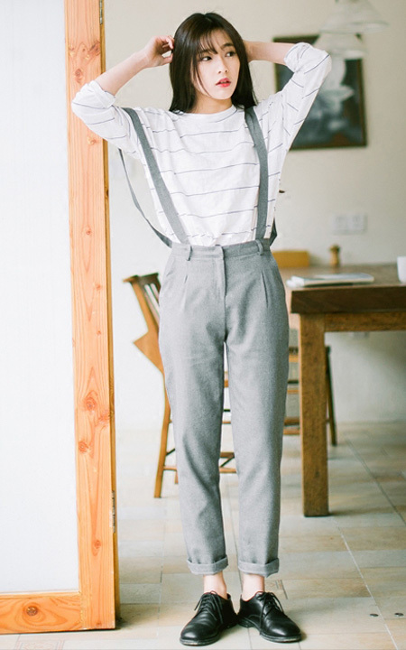 学院风的背带裤,宽松版型,穿着休闲无拘束,搭配色调温钝绵糯条纹T恤衫,脚着复古系带单鞋,十分减龄,文艺学院风。