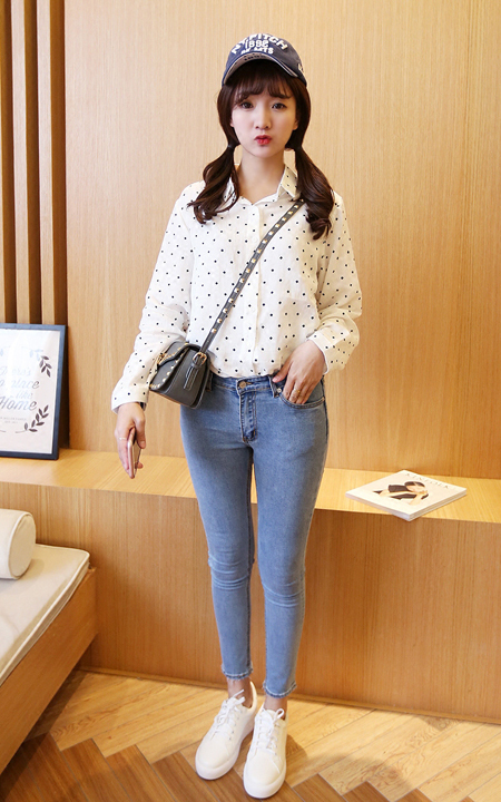 小清新的波点衬衫,修身的剪裁,上身很不错,搭配紧身牛仔裤,小脚的裤型,穿着很有气质。