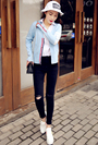宽松的吊带+开衫两件套,棉麻的材质噢,上身很舒服呢,透气吸湿,橡皮粉很显肤白,搭配一字扣粗跟鞋,休闲又好看
