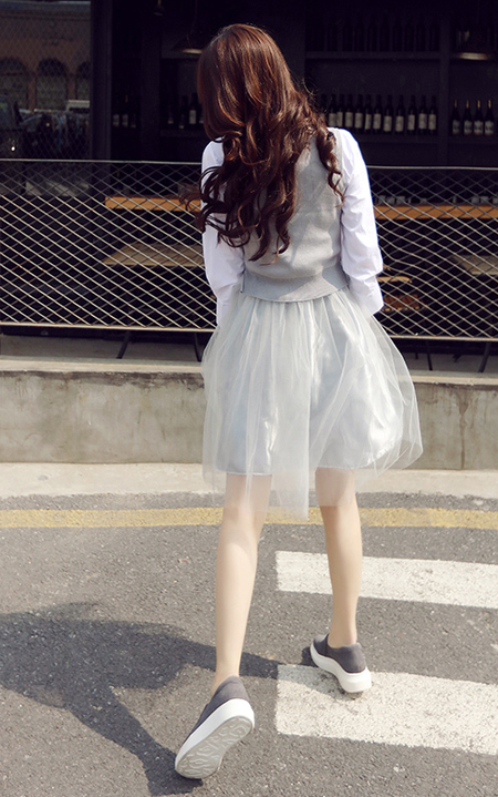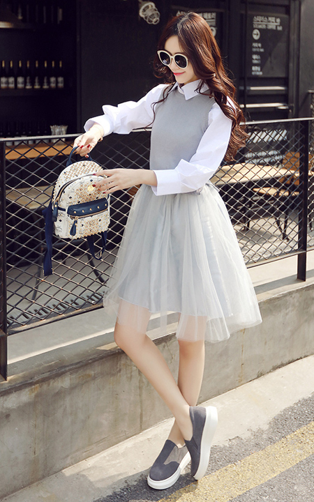 非常好看的一款两件套松紧腰连衣裙,里面衬衫单排扣,下面拼接两层纱,搭配一款简单的帆布鞋+双肩小背包,瞬间年轻充满活力!