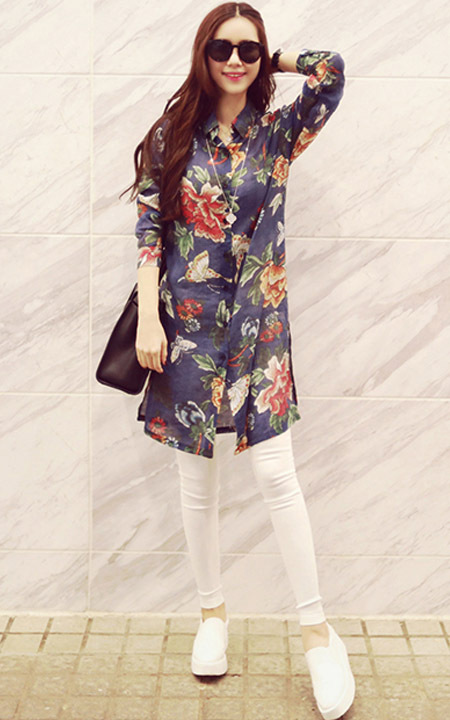 大花朵图案侧开叉中长款衬衫,面料柔软穿着舒适,搭配一条白色打底裤,休闲又时髦