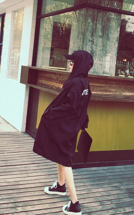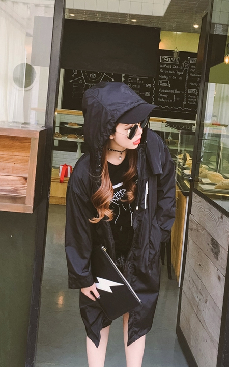 宽宽大大,超有范的中长款风衣外套,点缀字母印花,休闲连帽款,尽显街头潮范,内搭个性印花T恤,下着牛仔短裤,非常有范