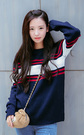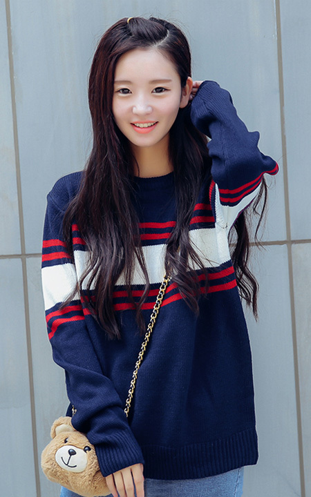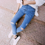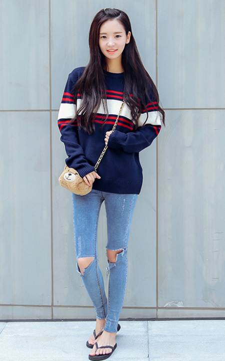 稍宽松的版型经典百搭条纹衫外穿内搭都可以,搭配修身版型,小脚裤型的破洞牛仔裤和人字拖,休闲又时尚