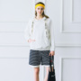 休闲大气的套头卫衣,连帽的设计,上身很不错,搭配一款条纹短裤,走到哪里都时尚大气,超赞。
