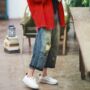 宽松的吊带+开衫两件套,棉麻的材质噢,上身很舒服呢,透气吸湿,橡皮粉很显肤白,搭配一字扣粗跟鞋,休闲又好看