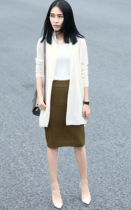 新款针织开衫,干净的色彩,纯粹中带着洒脱,随性的翻边,时尚中凸显个性,配上一条半身裙,简单大气
