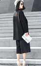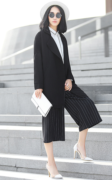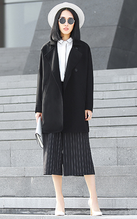 直筒侧开叉外套,这件衣服的特点就是大,大大的翻领打破传统衣服固有的严谨,手感轻柔易于打理,内搭白色雪纺衫,简洁大气