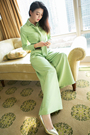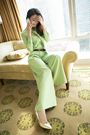 很有气质的一款套装,色彩饱满的若牙色十分的特别也十分的吸引眼球,搭配尖头细跟单鞋,整体搭配显得非常的端庄优雅。