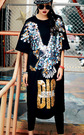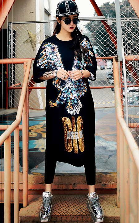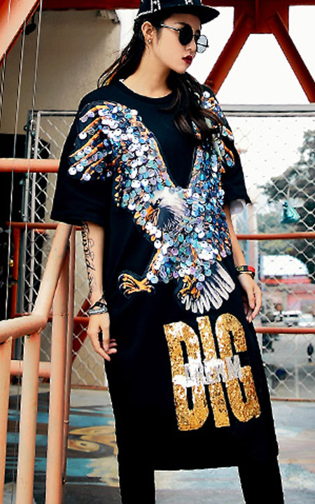 街头范儿宽松长款T恤,蓝色透明圆形小胶片装饰,个性十足,搭配一款休闲鞋,人群中必须是亮点