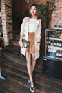 宽松的吊带+开衫两件套,棉麻的材质噢,上身很舒服呢,透气吸湿,橡皮粉很显肤白,搭配一字扣粗跟鞋,休闲又好看