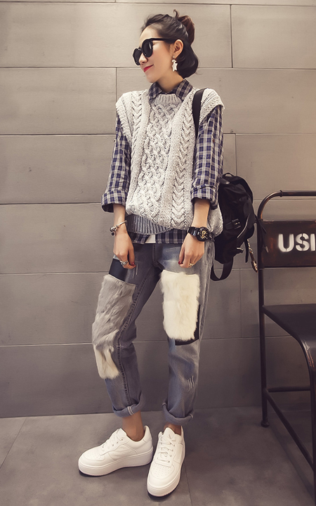 时尚的毛衣背心搭配格纹衬衫非常休闲时尚,不失清新甜美感,搭配的牛仔裤十分有格调,腔调十足