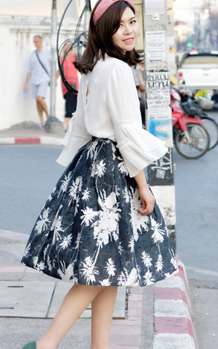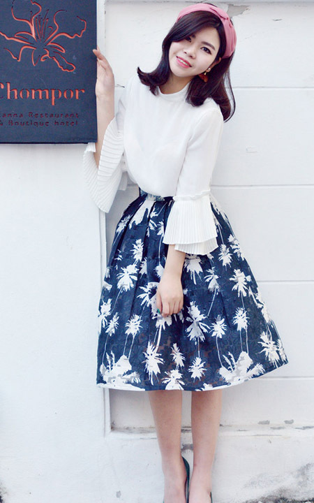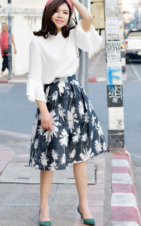 春款喇叭袖雪纺衫,直筒衣身的设计掩盖了多余的赘肉,面料柔软透气性好,搭配一条半身裙,简约又不失特色