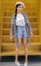 宽松的吊带+开衫两件套,棉麻的材质噢,上身很舒服呢,透气吸湿,橡皮粉很显肤白,搭配一字扣粗跟鞋,休闲又好看