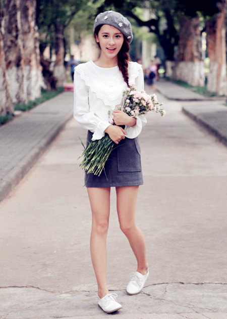 超级好看的吸睛蕾丝T恤+短裙套装,蕾丝钩花仙女又浪漫哦,搭配尖头高跟鞋时尚又好看~