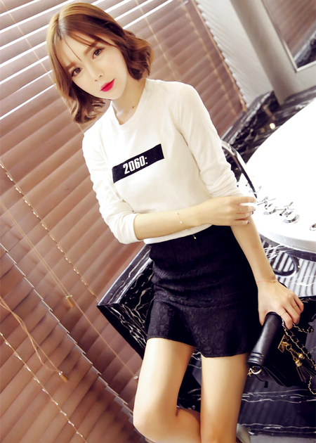 圆领常规款打底T恤,胸前胶印数字设计,比起纯色的更Beautiful,搭配有暗纹的口袋荷叶边鱼尾裙,很清爽呢~