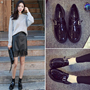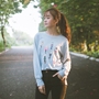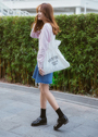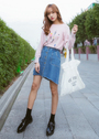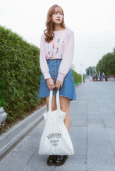 很宽松的一款长袖tee,卡通人物印花鲜明可爱,搭配A字单排扣+前短后长+毛边牛仔裙,超级清爽哟,再来双日系的小单鞋吧~