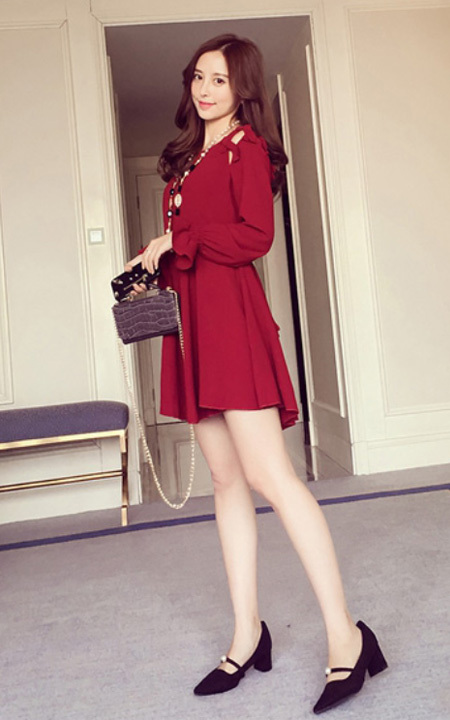 显瘦气质连衣裙,,肩部镂空加入优雅蝴蝶结装饰露出肩部的肌肤很美搭配珍珠绒面尖头粗跟单鞋甜美大方