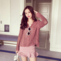 百搭镂空针织罩衫款,镂空绞花花型,版型略宽松,非常实穿搭配包臀设计的荷叶边短裙很甜美