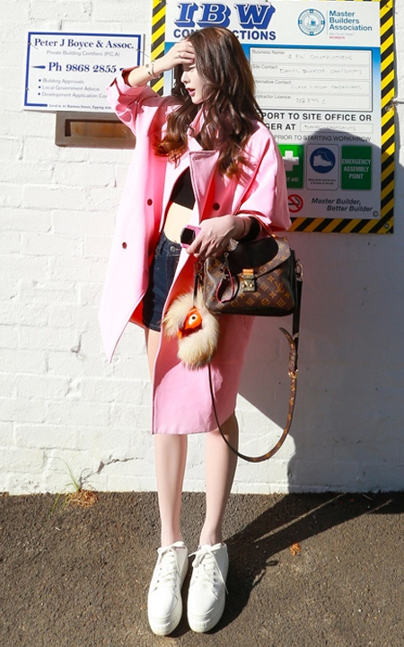 超级粉嫩少女心的风衣外套,经典双排扣,随性中长款,非常的洋气有范,穿着超美呢,内搭背心+牛仔短裤,尽显青春魅力