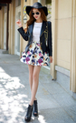 时尚翻领皮衣,修身的剪裁,上身效果极佳,内搭长袖T恤,下身搭配漂亮的半身裙,唯美印花,甜美迷人。