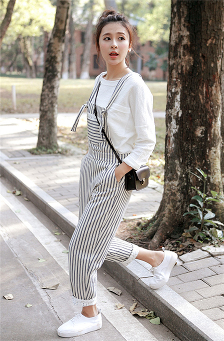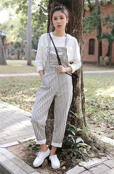 休闲竖条纹背带裤,搭配一件纯色前短后长开叉长袖T恤,显出你独特的气质,让裤子更加有型,展现出甜美的气质。