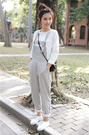 宽松的吊带+开衫两件套,棉麻的材质噢,上身很舒服呢,透气吸湿,橡皮粉很显肤白,搭配一字扣粗跟鞋,休闲又好看