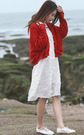 早春针织衫开衫是必不可少的单品,颜色特别美,很正的太阳红,搭配白色连衣裙,安静甜美。