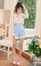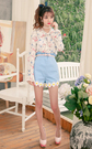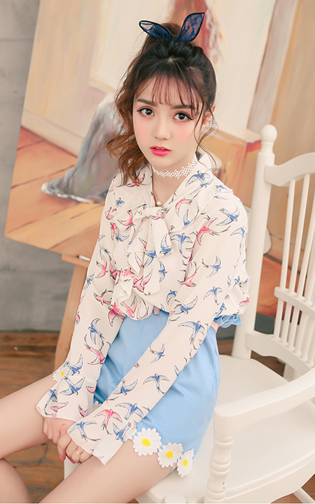 甜美淑女气质的雪纺衬衫,衣身满布浪漫飞鸟印花,流行的领口系带设计,穿着很美哦,搭配蓝色小雏菊花朵短裤,甜美可人