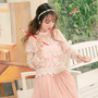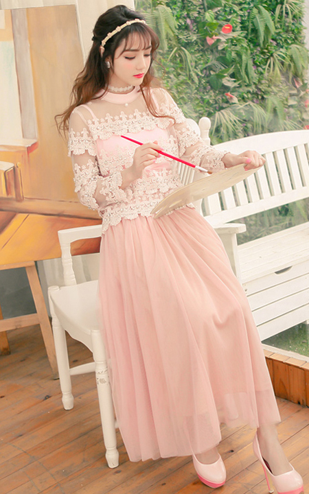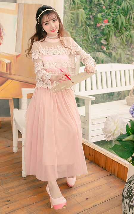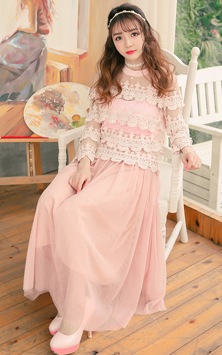 精美蕾丝拼接朦胧网纱,甜美淑女气质的两件套上衣,下搭超仙超美的网纱半身长裙,优雅迷人,女人味十足,超级女神范呢