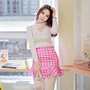 上衣太美了,镂空爱心上面有做一层网纱,独特的设计,搭配粉红格子的百褶裙裤,浅色系得衣服都非常好配,好可爱哟~