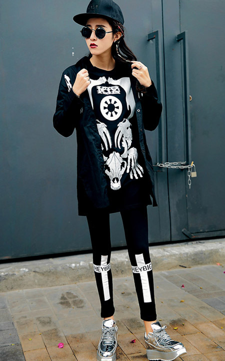 BF风长款衬衫,黑色底白色印花的强烈对比,非常有个性,透气性好,搭配一双休闲鞋,秒变潮流达人