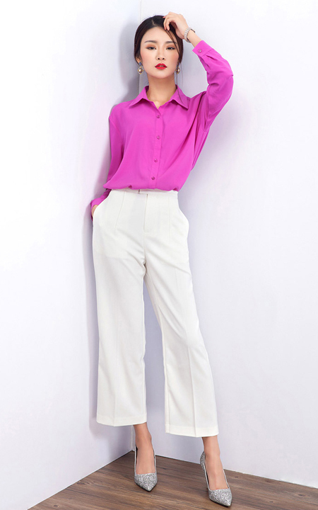 靓丽的衬衫,优质的面料,穿着很大气,凸显女人的魅力,搭配休闲裤,白色很干练,魅力十足!